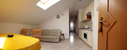 opis smještajne jedinice: trokrevetna soba (bračni + 1), kupaonica s wc-om i tušem, dnevni boravak, blagovaona i kuhinja su jedna porostorija, keramičke pločice na podu, pomoćni ležaj (kauč za spavanje), izlaz na balkon, dio balkona je natkriven, krevetnina i ručnici su na raspolaganju, klimatizirano, TV
